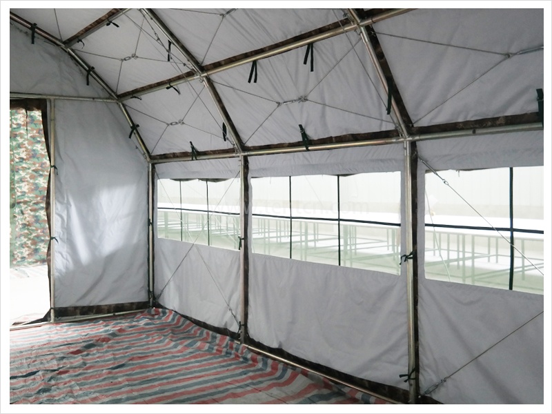 該帳篷結(jié)構(gòu)合理、空間開闊、安全可靠。穩(wěn)定性能優(yōu)良,抗風(fēng)承載、抗雪承載能力強(qiáng)。采用套管式通頭、彈簧插銷連接,互換性強(qiáng),無需任何組裝工具即可安裝替換。篷布采用滌綸草綠(林地?cái)?shù)碼)防水帆布,里布采用本白牛津布。其在抗拉、抗撕裂、耐老化、防雨等方面性能優(yōu)良。